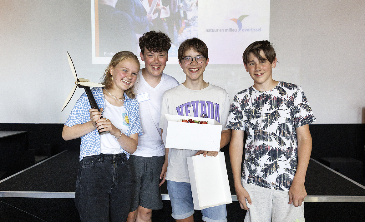Hoe kun je Overijssel energieneutraal maken? Hoe laat je inwoners beter energie besparen? Leerlingen van Het Groene Lyceum in Enschede deden onderzoek, vormden een eigen visie en mening en gaven antwoord op deze vragen in het project Adviseurs van de Toekomst. En het idee van leerlingenadviesbureau ‘Buiten Groen’ sleepte de winst in de wacht! Hidde van Ooststroom van Nieuwe Energie Overijssel mocht als voorzitter van de jury de prijs aan de leerlingen overhandigen.