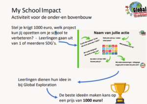 Als prijs kreeg Brechje een workshop aangeboden voor haar leerlingen: My School Impact. Afgelopen 17 juni was het zover. De leerlingen van het eco-team hielpen met de voorbereiding. In totaal deden 52 leerlingen mee aan de workshop. Julie Frijns van Stichting Global Exploration nam de leerlingen mee in de wereld van de duurzame ontwikkelingsdoelen (SDG’s). Daarna ontwikkelden leerlingen ideeën om impact te maken op deze doelen vanuit de context van de school.